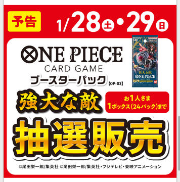 HOBBY WatchTCGバンダイバンダイ 関連記事関連カテゴリすべて見るすべてタカラトミーウィザーズ・オブ・ザ・コーストブシロードコナミデジタルエンタテインメントブロッコリーポケモン任天堂バンダイその他12次へ▲TCGプラモデル本日発売「ガンダムカードゲーム」より「スタートデッキ」4種&「ガンダムアッセンブルセット」4種が本日発売!(2025/7/12)セールTCG【Amazonスマイルセール】「ドラゴンボールスーパーカードゲーム」&「ワンピースカードゲーム」がお買い得【2025.5】(2025/5/23)TCGプラモデルボードゲーム「ガンダムカードゲーム」の「スタートデッキガンダムアッセンブルセット」付属ミニチュアガンプラ全12体が公開!(2025/2/22)TCG本日発売第2弾が登場! 「カードダス ちいかわ 2だん(パック)」本日発売!(2025/1/31)プラモデルTCGMSやパイロットを組み合わせて戦うトレーディングカードゲーム「ガンダムカードゲーム」、2025年7月にリリースが決定!(2025/1/6)TCGTCG「大貝獣物語 ザ・ミラクル オブ ザ・ゾーン」復刻版の3弾「グリフワール編 ハイレアリティーBOX」がプレミアムバンダイで予約受付開始(2024/10/4)TCGバンダイ、開封済みカードパックがカードケースに生まれ変わるリサイクルプロジェクトを始動!(2024/8/20)TCGあみあみにてTCG「ONE PIECEカードゲーム プレミアムブースター ONE PIECE CARD THE BEST」の抽選販売を実施(2024/6/12)TCG本日発売「機動戦士ガンダム SEED FREEDOM」より「カードダス 機動戦士ガンダム SEED FREEDOM(パック)」本日発売!(2024/2/2)TCG本日発売TCG「ONE PIECE カードゲーム アルティメットデッキ 3兄弟の絆【ST-13】」本日発売!(2023/12/23)TCGTCG「ワンピースカードゲーム 双璧の覇者」がプレミアムバンダイにて抽選販売受付を開始(2023/11/24)TCG楽天ブックスにてポケカ「シャイニートレジャーex」を含む17製品の抽選販売が実施!(2023/11/6)TCGTCG「ONE PIECEカードゲーム 双璧の覇者」抽選販売がイオン「キッズリパブリック」にて11月6日より順次実施(2023/11/2)TCG「ONE PIECEカードゲーム」に実写版ワンピースのルフィ達が収録された「プレミアムカードコレクション」が予約開始!(2023/10/18)TCG「ONE PIECEカードゲーム」より「プレミアムカードコレクション -ウタ-」がプレバンにて予約開始!(2023/10/13)TCG「ドラゴンボール」の新作TCG・DCG「ドラゴンボールスーパーカードゲーム フュージョンワールド」が2024年2月に発売(2023/9/7)TCGカードダス「機動戦士ガンダム 水星の魔女 Vol.2」の抽選販売がプレバンにて開始(2023/8/29)TCG「ONE PIECEカードゲーム」のブースターパック「新時代の主役」抽選販売が楽天ブックスにて開始!(2023/8/28)TCG「ワンピースカードゲーム」ブースターパック「新時代の主役」BOX抽選受付がプレバンでも開始!(2023/8/25)TCG「キッズリパブリックアプリ」にてTCG「ONE PIECEカードゲーム 新時代の主役」抽選販売受付中(2023/8/9)TCGAmazon、TCG「ONE PIECEカードゲーム」ブースターパック「新時代の主役」の招待販売を実施!(2023/7/11)TCG楽天ブックスにて、ポケカ「黒炎の支配者」を含む計13商品の抽選販売を実施!(2023/7/11)TCGワンピースカードゲーム「アルティメットデッキ “三船長”集結」がイオンスタイルにて抽選販売を実施!(2023/7/5)TCG「ワンピースカードゲーム」、ブースターパック「新時代の主役」に収録される3種のリーダーカードが公開!(2023/7/4)TCG「ガンダム 水星の魔女」よりキャリバーンなどが登場! バトスピコラボブースター「ガンダム第5弾」が2023年冬に発売決定(2023/7/4)TCGイオン、ワンピカード「アルティメットデッキ “三船長”集結」の抽選販売実施を予告! 7月5日11時より受付開始(2023/6/30)TCG「ONE PIECE カード」の25周年記念TCGセット再販分が本日予約開始! 麦わらの一味の原画イラストがデザイン(2023/6/28)TCG玩具ホロライブ0期生~秘密結社holoxがSDイラストで登場。「カードダス hololive」が6月30日に発売(2023/6/19)TCG「ONE PIECEカードゲーム」、尾田栄一郎氏描き下ろしカードが初公開! 8月発売のブースターパックに収録(2023/6/19)TCGTCG「ONE PIECE カードゲーム」1周年記念セットが登場! プレバンにて抽選受付実施(2023/6/16)TCG「ワンピースカードゲーム」ブースター第4弾「謀略の王国」抽選販売がプレバンにて開始(2023/6/6)TCGヨドバシカメラ梅田店にて「ポケモンカード」と「ワンピースカードゲーム」を6月3日と4日に販売(2023/6/1)TCGワンピースカードゲーム「謀略の王国」がガンギHOBBY SHOPにて抽選販売を実施中!(2023/5/30)TCGヨドバシカメラ梅田店にて「ワンピースカードゲーム」、「ポケカSV スノーハザード/クレイバース」などの販売を5月27日、28日に実施(2023/5/23)TCG「ONE PIECEカードゲーム」新情報予告か。電伝虫がプルプルするだけの動画が公開(2023/5/17)TCGあみあみ、TCG「ONE PIECEカードゲーム」の抽選受付を開始!「頂上決戦」と「ROMANCE DAWN」が対象(2023/4/4)TCG「ONE PIECEカードゲーム」にてモビー・ディック号とカバジが禁止カードに指定(2023/3/17)TCGTCG「ONE PIECEカードゲーム チャンピオンシップセット2022」の抽選受付がプレバンにて開始!(2023/2/20)TCGイオン九州アプリに