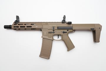 .45口径の弾薬を使用するコンパクトなハンドガンをベースに、特徴的な近接格闘用のストライクフェイスと発射時の反動を抑制するコンペンセイターが一体になったパーツを搭載。ホップ調整やメンテナンスの際には、工具不要で取り外しが可能となっている。