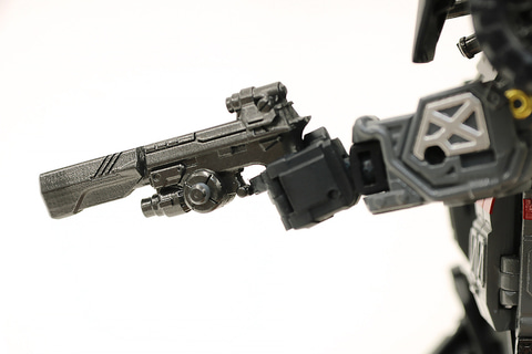 天野氏:アイアンハイドに付属するハンドガンをよく見ていただくと、持ち手が少し斜めに造形されています。これは実際のハンドガンのグリップを意識したものです。手に持たせるときは少し手首を前に可動させ自然に持たせることができます。