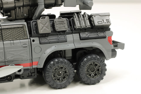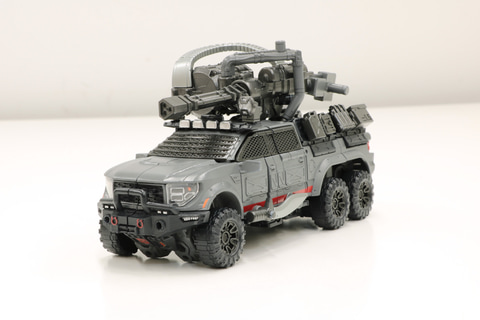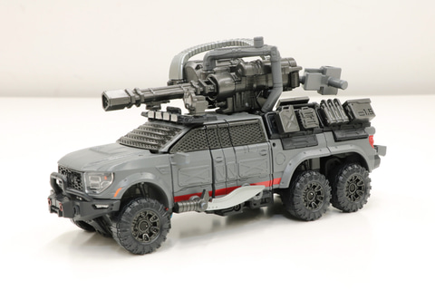 アイアンハイドは超大型でアメリカンなピックアップトラックを意識したデザインになっていまして、それを6輪にカスタマイズして、さらに戦いに向けてフロントガラスを金属の格子に入れ替え、側面には追加装甲をほどこした、民間警備会社のカスタム車両をイメージしています。