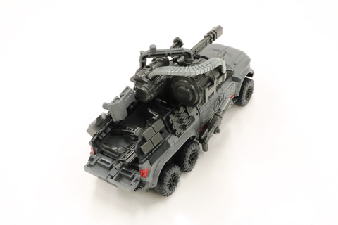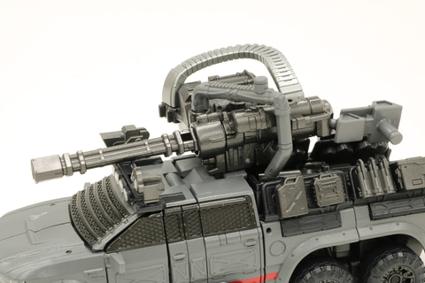 アイアンハイドの場合はビークルモードの時にスモークディスチャージャーやセンサーをルーフに取り付けることができるのですが、これらはロボットモードになった時に胸の下に配置されるようになっています。ライトも、ロボットモード時にほとんどが前面に来るように配置しており、そのまま前方を照らすといった機能を発揮できるようにしております。