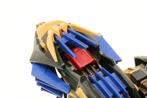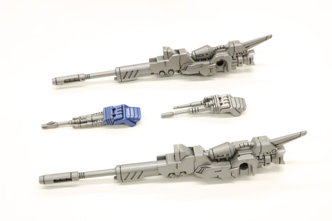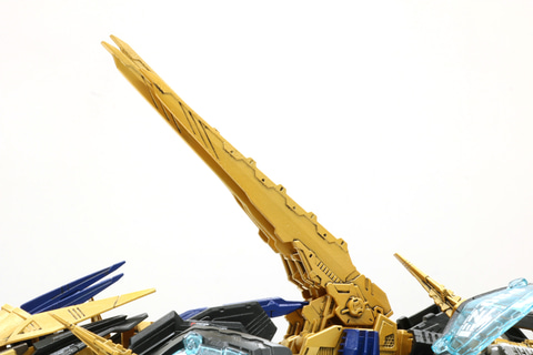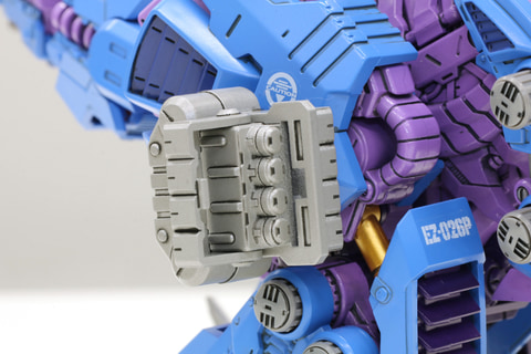 開発担当:背中のロングレンジパルスレーザーライフルもオリジナルのトミー版に近いフォルムにリニューアルしたものになっています。また、「AZ-09 ジェノザウラー」のロングレンジパルスレーザーライフルや頭部パーツも付属しているので、好みに合わせて付け替えることができます。