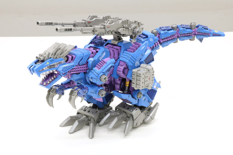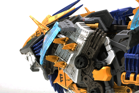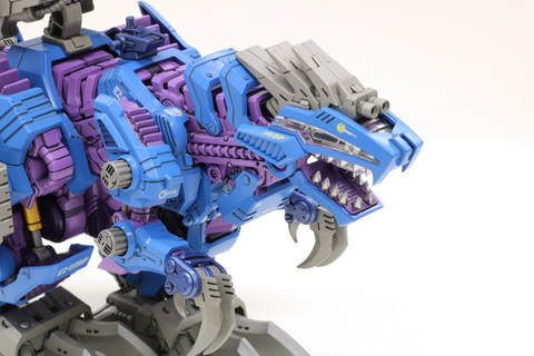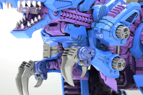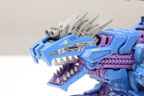 開発担当:発光ギミックは目元がサイコジェノザウラーに合わせて青色になっています。口部とゾイドコアは継続して赤で2色つかった商品です。