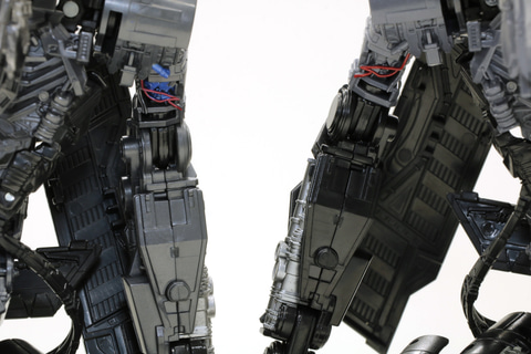 この部分は合体形態の時にすねに来るパーツでして、グレーのままだと「オプティマスプライムの足の裏だな」という印象が強く出ていると思いました。
