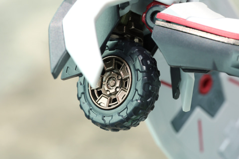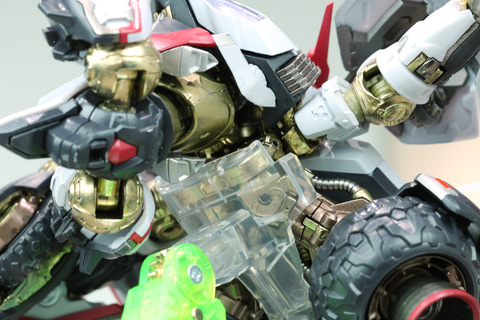変形でいうと本体に関しては、ビークルモード時の後部バンパーになるマニピュレーターが、どうしても変形ではできないので、そこだけ専用の手首に差し替えていただく形になっています。その他は設定に準拠した変形ができるようになっています。