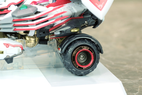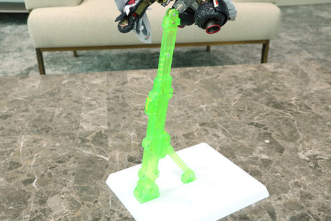 企画担当者:そうですね。人型形態では通常の台座を使用していますが、ビークルモードではクルマらしい縦長のフォルムになるので通常の台座に別のパーツを追加して縦長の台座になるようにしています。