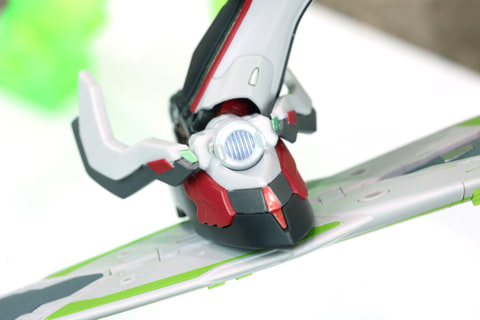 企画担当者:また、胸の部分のライト部もクリアパーツの中をシルバーに塗ったり、肩のところにある緑色のクリアパーツなどは内部にモールドを入れたりと「ニルヴァーシュが現実にあったら、こんなにも多彩な情報量で構成されているんだ」と感じて頂ける、立体物ならではの表現ができたかと思います。
