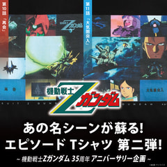 エピソードTシャツは、「機動戦士Zガンダム」が2020年にTV放映から35周年を迎えたことを記念して発売されている企画商品。懐かしのあのシーンをフルカラープリントで再現している。毎月2種ずつ、全20種類がリリース予定となっており、第2弾には、10話「再会」、第11話「大気圏突入」が登場する。第3弾では、第12話「ジャブローの風」、第14話「アムロ再び」が展開される予定だ。