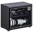 超望遠レンズを横置きで収納できるワイドタイプの電子式防湿庫。ダイヤルを回すだけで最適湿度40~50%前後を一定に保つことができる。温度と湿度はアナログ式の温/湿度計で確認が可能だ。本体はスチール製、扉には強化ガラスを使用しており、全ての棚に保護マットが付いている。意図せぬ持ち出しを防ぐ鍵付き。
