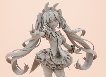 ケープやスカートもふわりと動きのある造形となっている。帽子はマグネットが内蔵されており着脱が可能。台座はファンマークの三日月をモチーフとしたデザインとなっている。