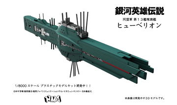 本商品は「銀河英雄伝説」より「自由惑星同盟軍 第13艦隊旗艦ヒューベリオン」と「自由惑星同盟軍 標準型戦艦」を1/8,000スケールでプラモキット化したもの。キットはヒューベリオン×1個+標準型戦艦×2個のセットとなっている。
