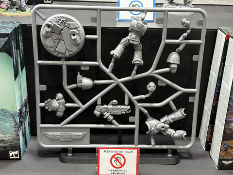 ブース内では、通常販売しているサイズよりかなり大きいサイズの「インフェルヌス・マリーン」のランナーとミニチュア、「リベレイター」のミニチュアが飾られている。これはプラスチックとして製品化する前、パーツ構成やランナーも同一のままレジンで出力し、構造を確認するものだという。ゲームでは使えないが、ディスプレイモデルとして存在したら買ってしまいそうだ。