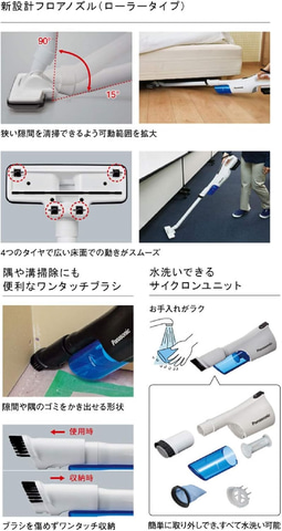 本商品は、紛じんを遠心分離するサイクロン方式を採用した掃除機。ごみフィルターに紛じんが目詰まりしにくいため、吸引力が持続する。隅や溝掃除に活躍するワンタッチブラシが付属。ダストケースはゴミの量がひと目でわかる半透明で、床に干渉しにくい前面傾斜になっている。