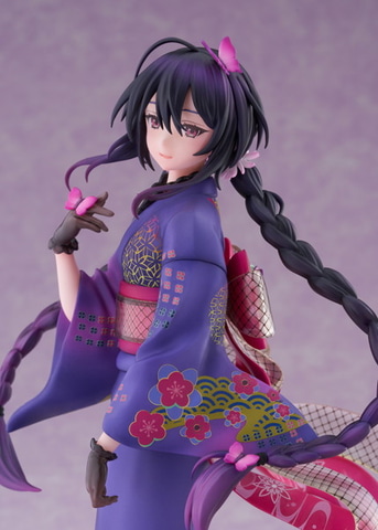 まるで烏の濡れ羽色のような黒紫色のロングヘアをおさげに編み、ふわっとそよ風を浴びたような髪の毛や腰元のリボンの柔らかい動きをスケールフィギュアで再現している。