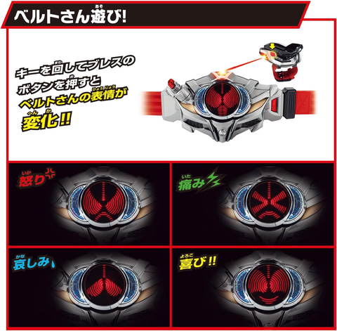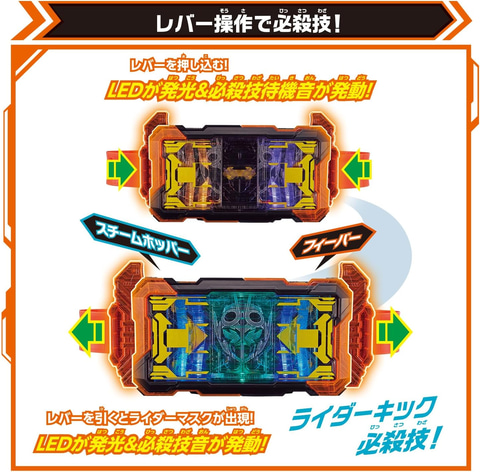再びレバー操作を行なうと、LED発光&必殺技音が発動。レバーを押し込むとライドケミートレカがポップアップし、ベルトにセットしたライドケミートレカが取り出せる。さらに、別売りのライドケミートレカを集めると50種類以上の変身音を鳴らすことができる。