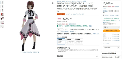 Amazonにて、プラモデル「30MS 天海春香 (20th Anniv. YOU AND アイ!)」が販売再開している。価格は5,060円。