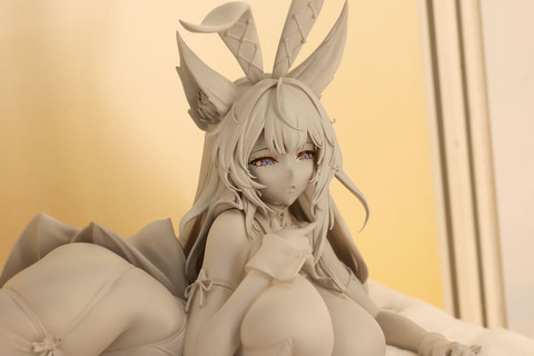 今回は、ふんわりとしたソファーに横たわっているポーズになっている。そうしたこともあってか、表情もどこかまったりとしているようだ。頭に付けた大きなうさ耳や、ボディに密着したバニースーツなどもバッチリ再現されている。ちなみに今回の展示には含まれていなかったが、巨大な尾部パーツは柔らかな毛足素材で作られる予定だ。