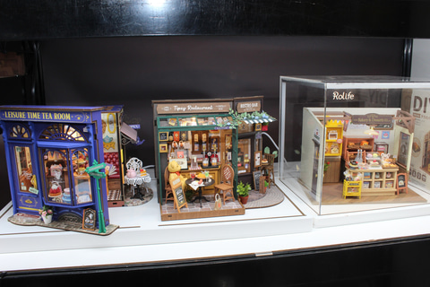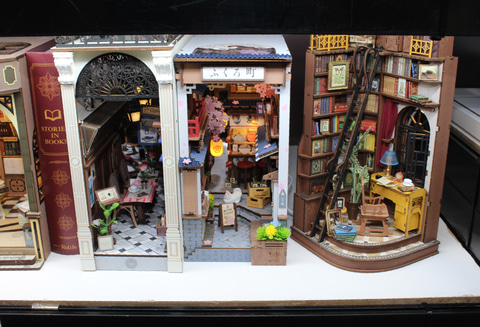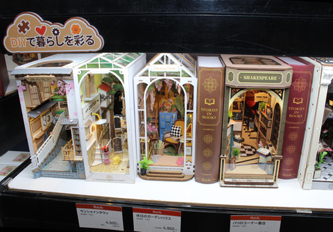 ドールハウスも簡単に組み立てられる仕様ながら、完成度の高いものが揃っている。中でも面白いかったのは「BOOKNOOK」のシリーズで、その形状やサイズを書棚の本に近いサイズにしたキットだ。高さ200mm前後、幅115mm前後で、組み立てて書棚に設置することで、本の隙間に異空間が現れたような雰囲気を楽しめるのだ。