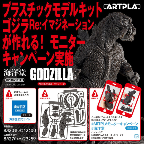 海洋堂はXにて「ARTPLA SCULPTURE WORKS ゴジラ Re:イマジネーション」モニターキャンペーンを告知した。応募期間は8月20日12:00~8月27日23:59まで。応募フォームにて申し込むことができる。