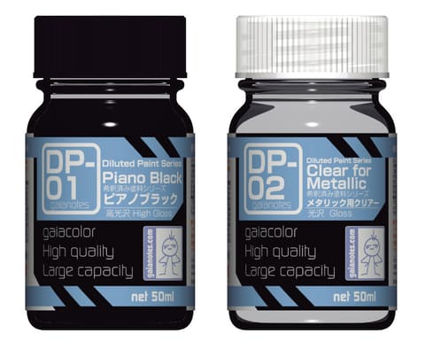 イベントやオンラインショップで販売されてきた「DP-01 ピアノブラック」と「DP-02 メタリック用 クリアー」の2色が一般販売。DPシリーズは、最初からエアブラシ用に希釈済みの塗料となっている。