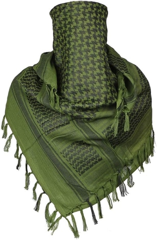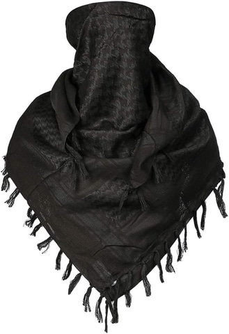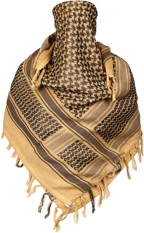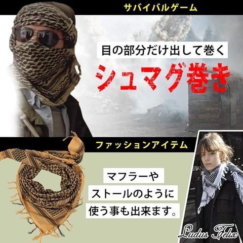 綿100%のアフガンストール(シュマグ)。110×110cmの正方形で大判なので、アレンジ次第でいろんな巻き方・使い方が楽しめる。サバイバルゲームで、目の部分だけ出して巻くシュマグ巻きにすれば、フェイスマスク代わりになる。