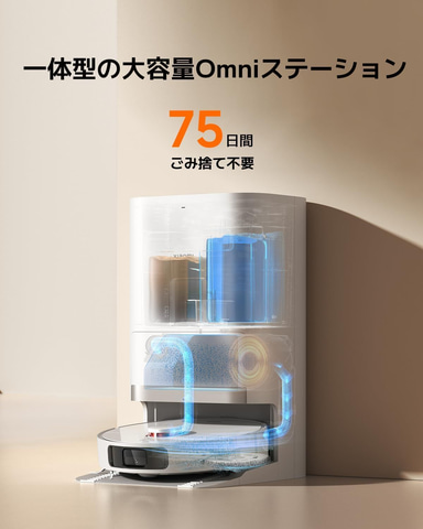 一体型の大容量Omniステーションは、デュアル自動ごみ捨てダクトが、わずか10秒でダストボックスを空にする。大容量のダストバッグは、最長75日間使用でき、ごみ捨て不要で掃除を行なうことができる。また、4L大容量ウォータータンクは頻繁な水補充が不要。満水の場合、最大280m平方メートルのモップがけが可能。