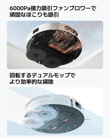 6000Pa強力吸引ファンブロワーにより、吸引力が大幅にアップ。汚れや髪の毛、小さなほこりを床の隙間から吸い取って念入りに掃除を行なう。回転するデュアルモップでより効率的な掃除を実現、手で拭く時の圧力をシミュレーションしており、コーヒーのシミ、泥汚れなどの汚れを拭き取る。