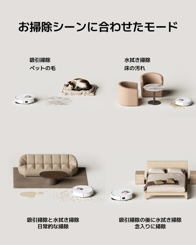 4つの吸引および水拭きモードを搭載、吸引掃除モードは強力にゴミやホコリを吸引し、水拭き掃除モードは床の汚れを水拭きで取り除く。吸引掃除と水拭き掃除モードは同時にこれらを行ない、効率的に掃除ができる。吸引掃除の後に水拭き掃除モードでは、2段階で徹底的に床を清潔にしてくれる。これらのモードは、さまざまな掃除シーンに応じて設定可能で、日常の掃除を簡単かつ効果的に行なえる。
