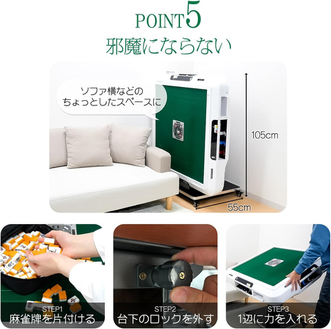 遊ばない時はコンパクトになり空きスペースに収納できる折りたたみ機能付きの多機能全自動麻雀卓。真ん中の形が四角になっているので、きれいな横列にすることができ、サイコロもボタンを押すだけで回せる快適仕様となっている。