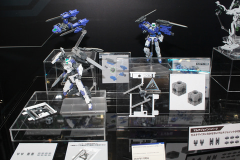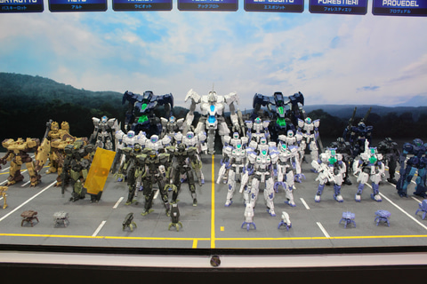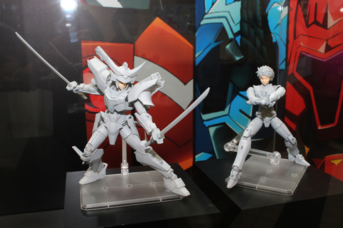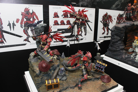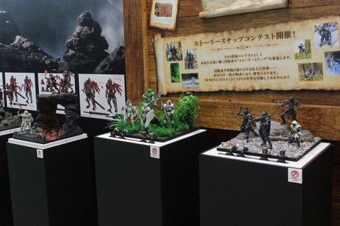 30MFシリーズは各勢力のジョブの系統図にデザイン画を添えて展示。また世界観に合わせた勢力ごとのジオラマも設置された。11月に発売される新たな種族「竜神族」の「30MF ドラゴニアナイト」や、「鎧真伝サムライトルーパー」とのコラボアイテム「灼熱のガイ」にも注目だ。