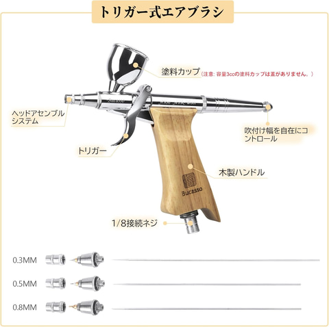 エアブラシ(ハンドピース)のセット。作動方式は長時間の作業でも指が疲れにくいトリガータイプを採用している。0.3mm口径が標準装備だが、0.5mmと0.8mm口径も付属し、用途に合わせて手軽に交換できる。ボディの素材には真鍮材質を採用し、耐摩耗性に優れているだけでなく長寿命。人間工学に基づいた木製ハンドルは、手に快適な感触を与える。ジョイントも一般的なSネジ(1/8)仕様となっており、市販されている多くのエア源に対応できる。