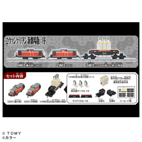 本製品は劇場アニメ「ヱヴァンゲリヲン新劇場版:序」に登場した同名車両編成をプラレールで再現したもの。「シキ880(B2梁)大物車」はパーツを分割し、変圧器部分を「500 TYPE EVA ポジトロンフォーム」に搭載できる。