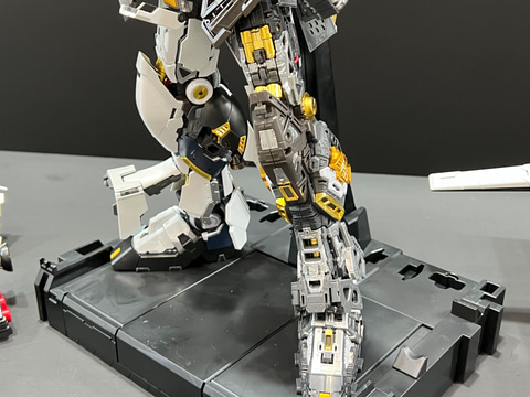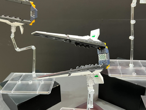 今回イベント会場では、「PERFECT GRADE UNLEASHED 1/60 νガンダム」の展示エリアが設けられており、専用LEDユニットを搭載した姿を初展示しているほか、フィン・ファンネルを展開した姿、ランナーや内部フレームなどを確認できる展示も行なっている