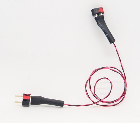 LEDやスイッチをもっと自由に配置するための2ピン延長ケーブル。配線長は約200mmで、ツイスト加工済みで取り回ししやすく、絡みにくくなっている。コネクタは、ピンコネクタ(オス)とソケットコネクタ(メス)を組み合わせ済み。赤/黒の配線+赤線マーキングで極性間違いも防止。
