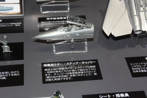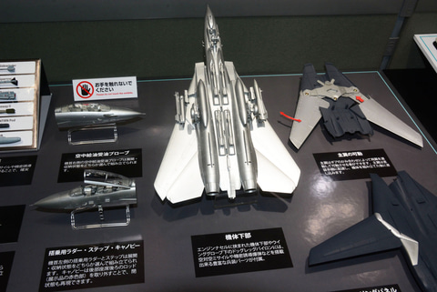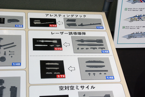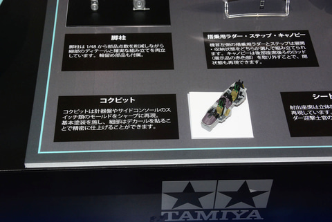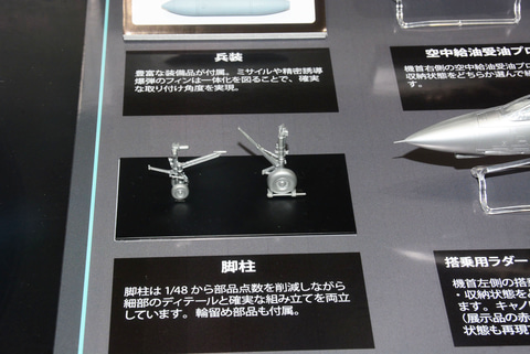 「1/72 グラマン F-14D トムキャット」では、基本的に「1/48」の設計をサイズダウンしての表現となる。展示台では1/48と1/72のパーツの比較も行われていた。単純にパーツを小さくするのではなく、小サイズになることでパーツ点数を減らし、それでいながら精密さや情報量は1/48が持っていた雰囲気をできるだけ再現するものとなっているとのこと。