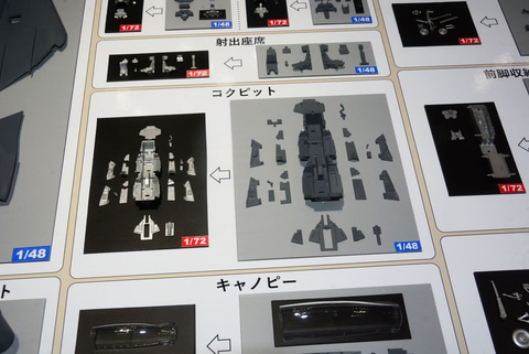 例えばコクピットは1/48とほぼ変わらないパーツ分割になっており、こまかくコクピット内部を表現している一方で、分割されていたエアインテークダクトは1パーツ。計器板なども部品が統合されており、ミサイルの羽根の分割なども少なくなっている。