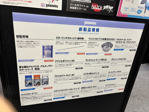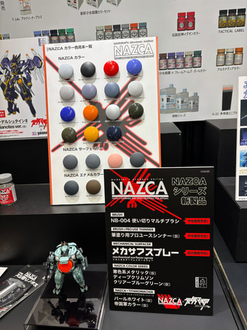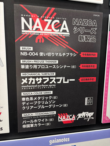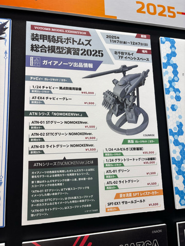 そのほか、ガイアノーツブースでは11月7日開催予定の「装甲騎兵ボトムズ 総合模型演習2025」での出品情報やNAZCAシリーズの新製品情報などが告知されている。