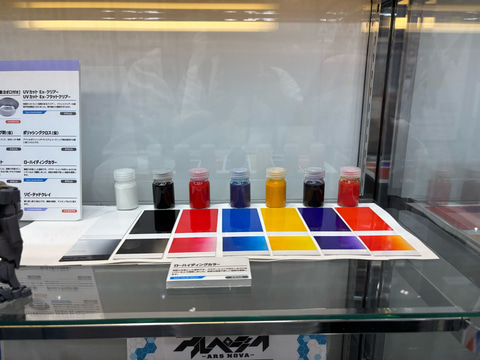 「ローハイディングカラー」は、名前の通り隠蔽力を落とした塗料。グラデーションやぼかしに向いた塗料として調整されている。こちらも参考出品で会場にサンプルが展示されている。発売時期は未定。