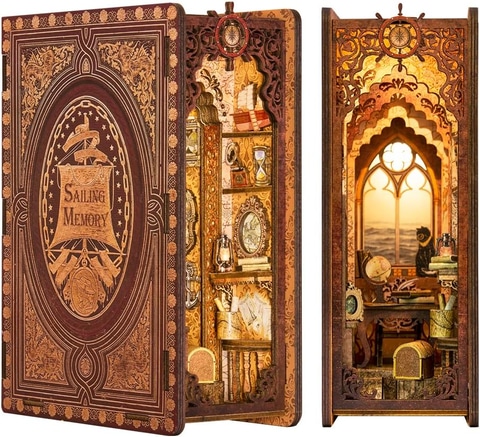 本商品は、本棚の隙間に差し込むジオラマ「ブックヌック」の木製キット。ダストカバーとLEDライトが付いている。今回のセールでは、「航海の記憶」や「文学書店」、「ダークな標本館」、「不思議な音楽工房」、「魔法師の家」など、小さな空間に魅力が詰まったミニチュアドールハウスがラインナップされている。