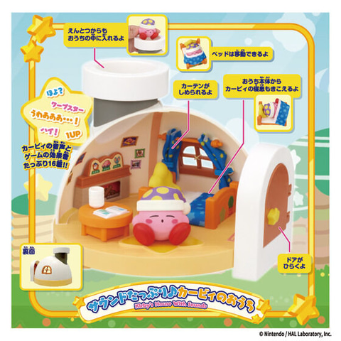 本商品は、「星のカービィ ディスカバリー」に登場する、カービィのおうちを再現したもの。ゲーム内と同様に、煙突からカービィを家の中に入れることができる。本の部分がスイッチになっており、カービィの音声、ゲームの効果音が楽しめる。掛け布団は布製でカービィにかけて遊ぶことも可能だ。サウンドには寝息も収録されている。また、別売りの「チェンジ!コピー能力フィギュア」と一緒に遊ぶこともできる。