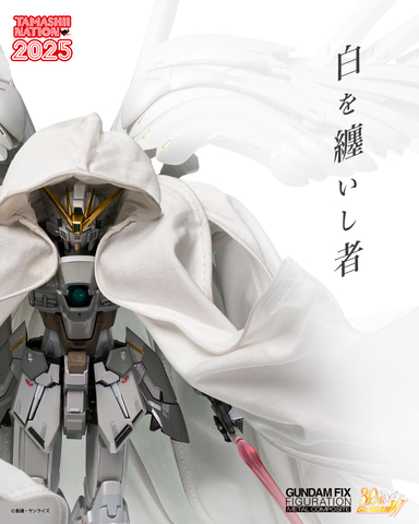 公開された画像では全身と頭部を覆うマントとフードを纏った白いモビルスーツが確認でき、「新機動戦記ガンダムW」30周年のロゴマークが確認できる。