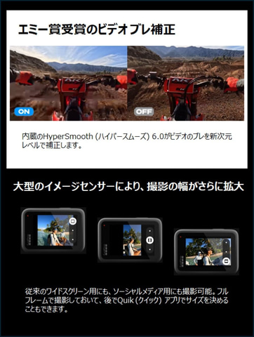 また、HyperSmooth 6.0でカメラ内ビデオ補正機能が向上。HyperSmooth AutoBoostを使えば、スピードや動きに応じてショットをシームレスに調整できるため、常に最も幅広い画角で滑らかな映像を記録することが可能だ。
