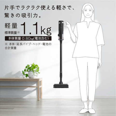 片手でラクラク使える軽さ(軽量1.1kg)と吸引力を両立し、自走コンパクトヘッド」でごみをしっかり吸い込む。ヘッドが左右90度曲がってラクにお掃除できる「クルッとヘッド」、家具の下の奥までヘッドが届く「ペタリンコ構造」、髪の毛などがからまりにくい「からまんブラシ」、回転ブラシを簡単に取り外せる「ワンタッチ着脱」、ごみ捨てを簡単に行なえる「ごみダッシュ」などを搭載している。