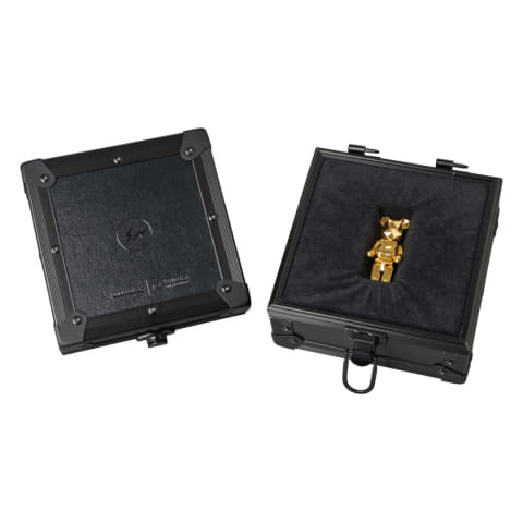専用の収納ケースは「fragment」のサンダーロゴに加え、BE@RBRICKと田中貴金属のロゴを配している。本体重量は250g。
