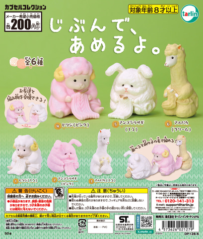 「ヒツジ(しろ)」「ヒツジ(ピンク)」「アンゴラウサギ(しろ)」「アンゴラウサギ(ピンク)」「アルパカ(しろ)」「アルパカ(クリーム)」の全6種がラインナップされている。