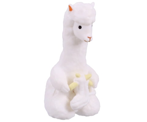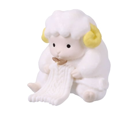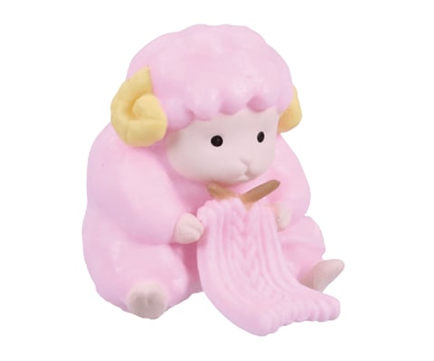 本商品は、ヒツジやアンゴラウサギ、アルパカが毛糸で編み物をしている様子をミニチュア化したもの。縦に並べると前のミニチュアの毛を編んでいるように飾ることができる。