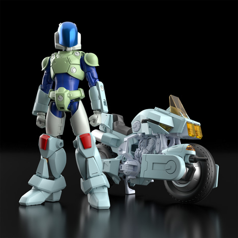アニメ『機甲創世記モスピーダ』より、Military Operation Soldier Protect Emergency Aviation Dive Auto通称「モスピーダ」のスティック仕様、レイ仕様をMODEROIDシリーズでプラモデル化したもの。