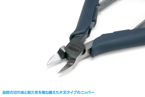 本製品は、プラスチックモデルの部品の切り取り専用ニッパーで、抜群の切れ味と耐久性を兼ね備えた片刃タイプのニッパーとなっている。