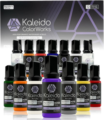 Kaleido独自のRapidAirテクノロジーを搭載し、ラッカー塗料に匹敵するスムースな吹き心地を実現した水性アクリルエアブラシ塗料セット。模型フィギュア、ジオラマ、情景制作などに適している。にじみ・タレ・エッジの塗料溜まりを防ぎ、15~20分で指触乾燥するため、作業効率も向上する。