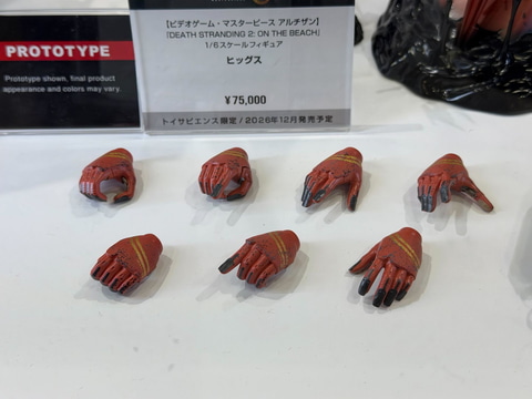 今回同社ブースにて本製品のサンプルを展示しており、「ヒッグス」では、不穏な笑みをうかべる様子や、様々なハンドパーツ、マント、オドラデクなどの付属品が用意されているほか、「サム(デラックス版)」では、ハンドパーツのほかにも様々な小物が付属しているのを確認できる。